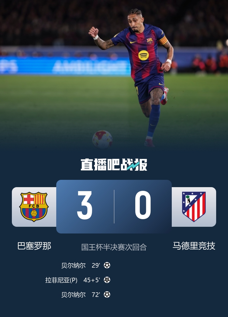 无缘决赛!巴萨3-0总比分3-4马竞 贝尔纳尔双响孔德巴尔德伤退