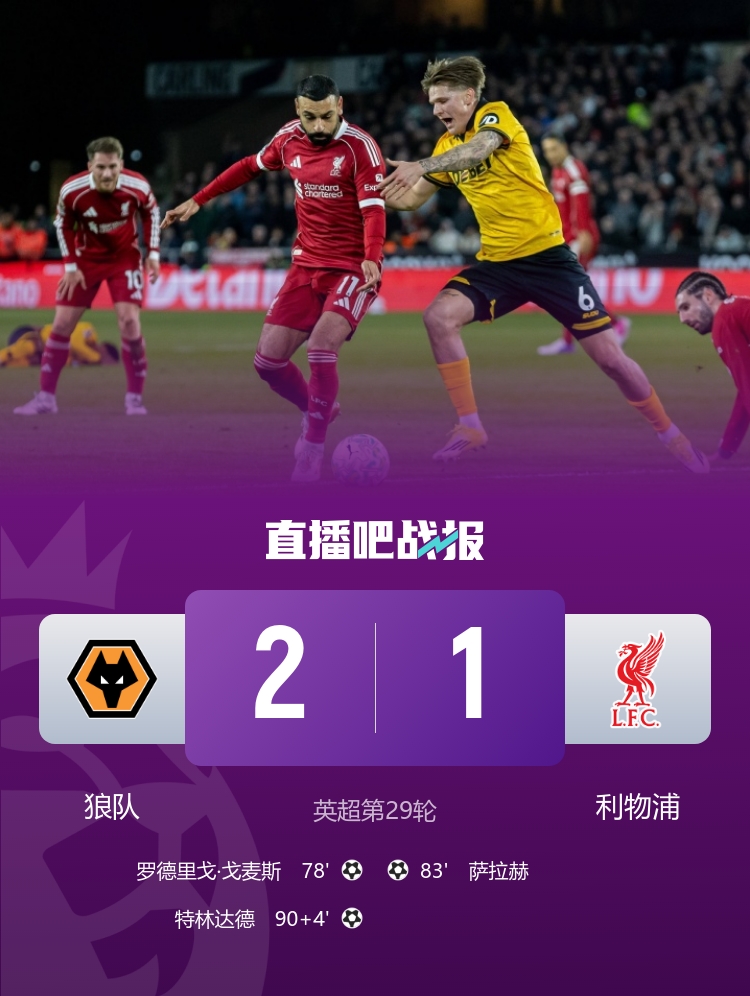 3连胜终结!利物浦1-2狼队仍第5 萨拉赫破门加克波离谱空门变解围