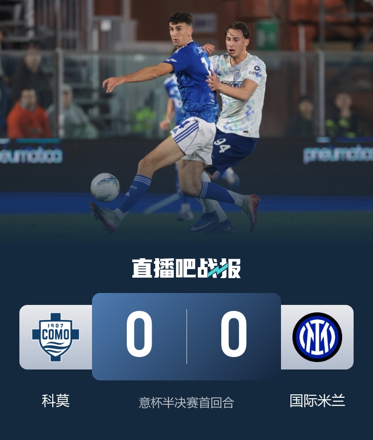 意大利杯半决赛首回合,国米客战科莫。上半场双方均无建树,瓦莱错失良机,国米全场均无射正。